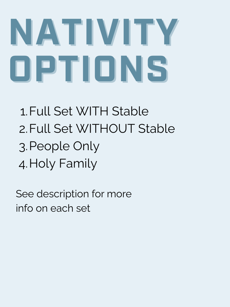 Additional pieces for the Nativity (including various ethnicity options for characters) can be purchased separately by going to the individual listings for each item in our shop. You can find the section for Nativity pieces here: